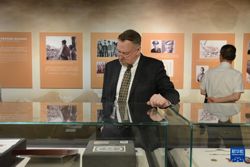 6月24日,美中航空遗产基金会主席杰弗里·格林在参观“铭记英雄——飞虎队主题历史图片展”。