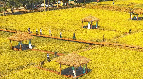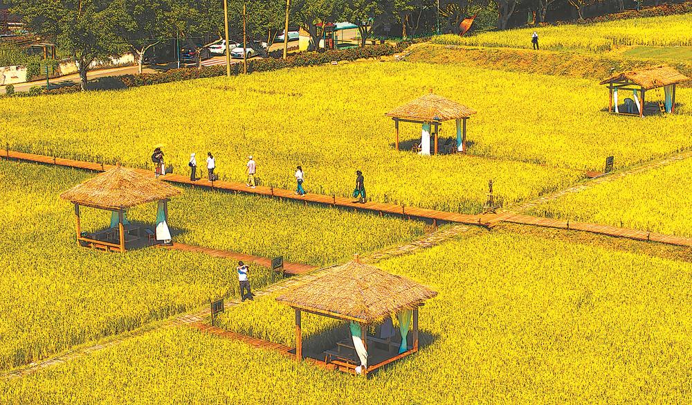 8月9日,厦门市海沧区东孚街道天竺山下新开放的稻田咖啡打卡点“知稻咖啡”吸引了不少游客(如图)。当下,水稻即将进入成熟期,盛夏的风吹起开始变得金黄的稻田,田间点缀着的茅草亭、白纱帘和远处的露天咖啡木屋,在蓝天白云和金黄稻浪中形成了一幅童话般的画卷。(通讯员林旭东 摄影报道)