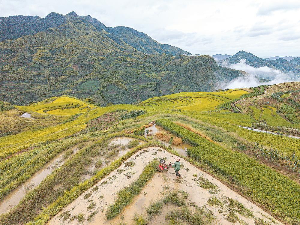 24日,当地村民在梯田里劳作。