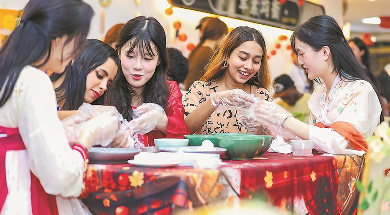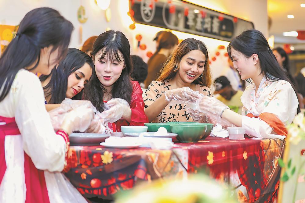 29日晚,一场以“月圆颂华诞灯火映中秋”为主题的游园会在福州外语外贸学院举办,中国学生与来自印度尼西亚、乌兹别克斯坦、摩洛哥等国的留学生们欢聚一堂,一起体验做月饼、画花灯等非遗乐趣,沉浸式感受中国传统文化的魅力。图为福州外语外贸学院留学生和中国学生一起体验制作月饼。