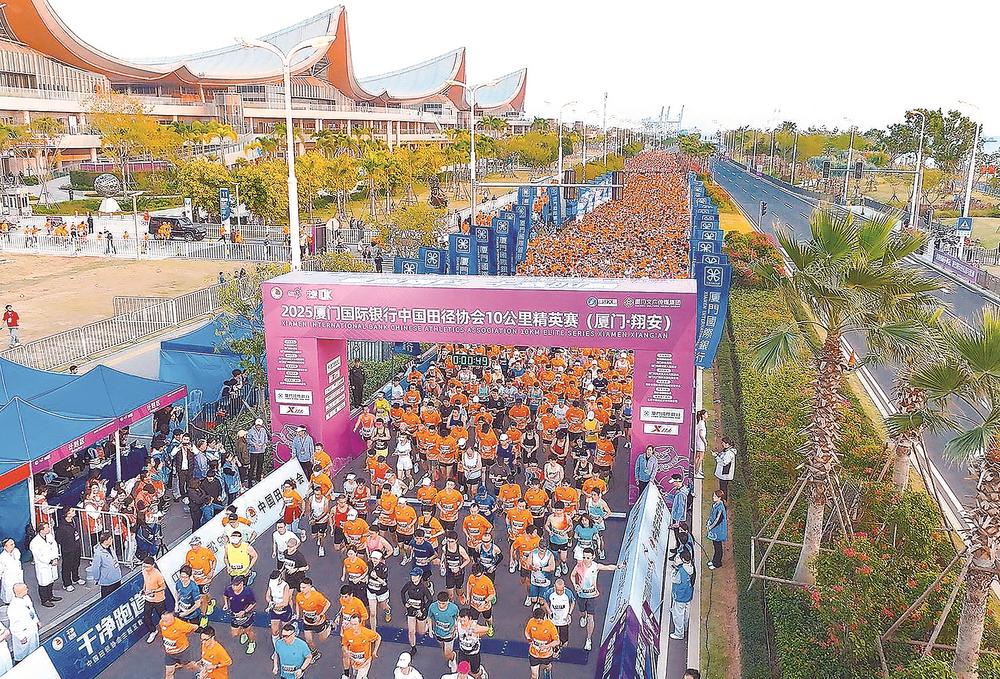 22日,厦门举行10公里精英赛,来自全国的7000余名跑者齐聚翔安欢乐开跑。赛事首次采用傍晚起跑模式,让跑者尽览“山海城交融”的绝美晚霞。报业集团记者林梓健 通讯员 康倩颖 摄影报道