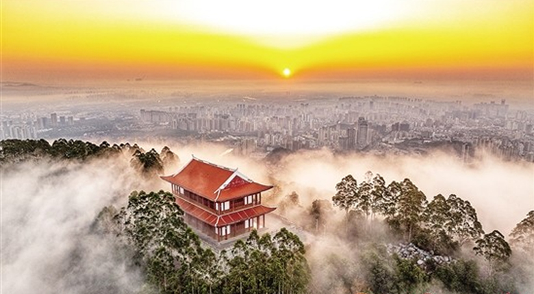 12月11日,红日初升,莆田天马山上云雾缭绕,天马阁隐现林间,宛如仙境,尽显生态宜居之美。