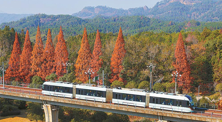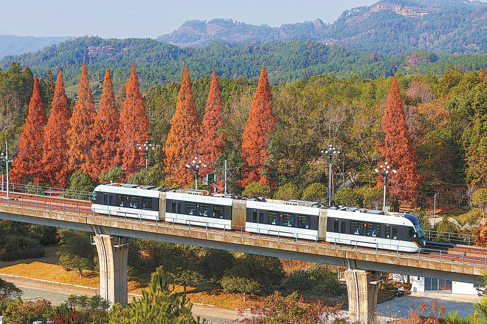冬季的武夷山国家公园,层林已然被晕染成斑斓的调色盘,一辆淡绿色的有轨电车,正循着轨道缓缓穿行在这幅天然画卷里。它像是从冬韵里游出来的精灵,车轮与轨道轻触的声响,细碎得如同山风拂过竹叶的呢喃。车窗外,漫山遍野的冬季景色次第铺展,时而掠过缀满野果的灌木丛与红叶;车厢里的人,或倚窗远眺,或举着相机定格眼前的盛景,连呼吸都不自觉放轻,生怕惊扰了这方冬日的静谧。