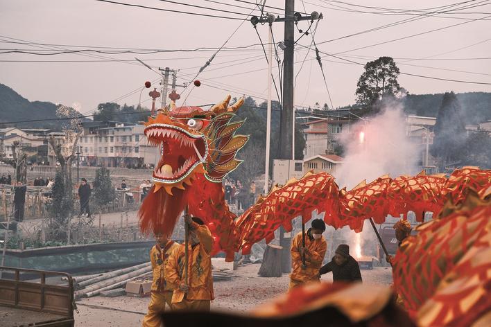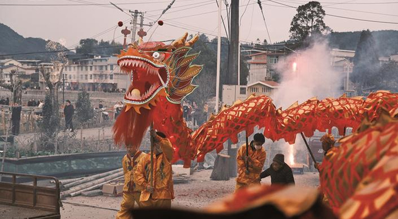 2月19日,正月初三,福建省尤溪县汤川乡下井村举行传统舞龙灯民俗活动。夜幕降临,伴随着铿锵有力的锣鼓声与阵阵鞭炮声,一条百米长龙在村道和农家庭院间穿梭腾跃,时而昂首摆尾、上下翻飞,时而盘旋起伏、气势十足。烟花与灯火交相辉映,吸引众多村民及返乡群众前来观看。现场气氛喜庆热烈,年味十足。