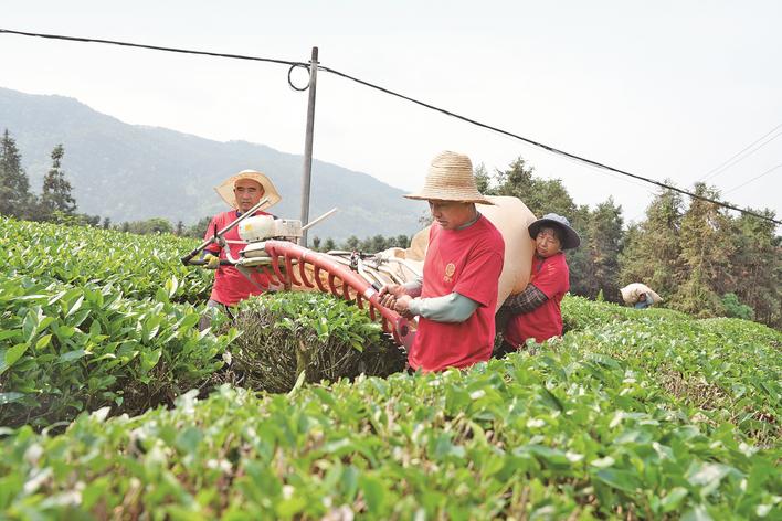 4月14日,在位于三明市沙县区夏茂镇西街村的天宝峰生态茶园,工人们手持双人采茶机,在连绵的茶垄间有序穿梭,加紧采收春茶。2026年,沙县区共有茶园面积1.52万亩,预计春季可采收各类茶青2300吨,全产业链产值达3.2亿元。(沙县记者站吴 伟 摄)