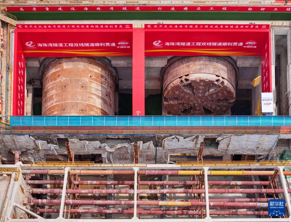 当日,由中铁十四局承建的广州海珠湾隧道两台15.07米超大直径盾构机破土而出,实现双洞贯通。