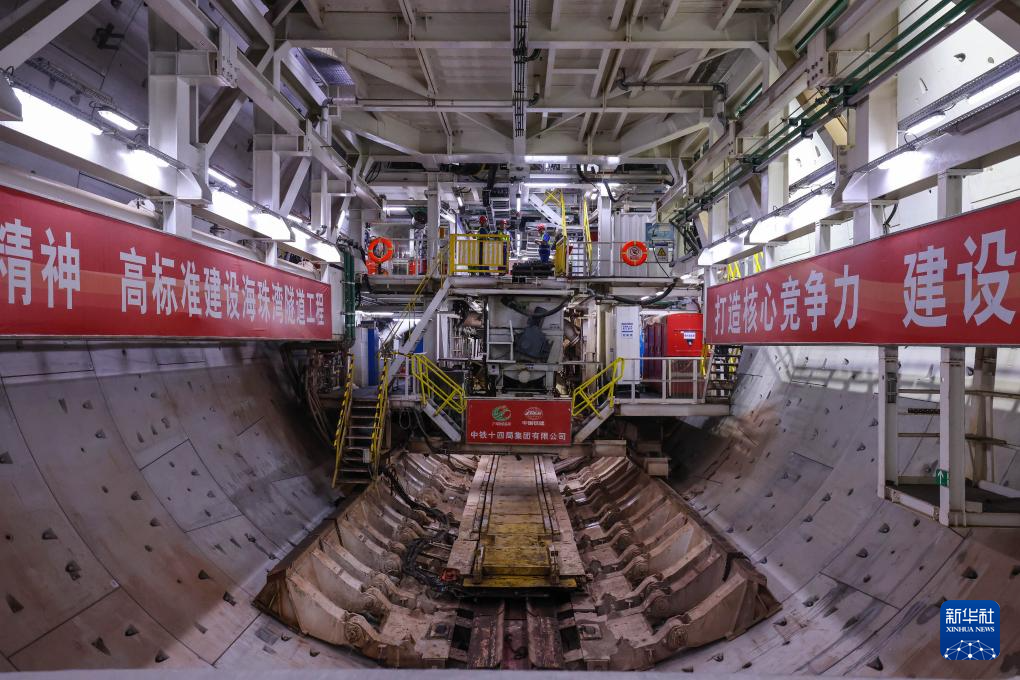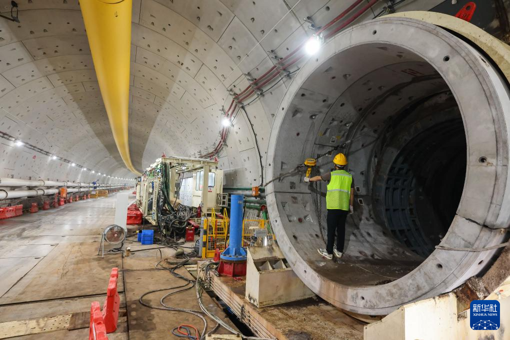 7月15日,施工人员在广州海珠湾隧道西线“大道先锋号”超大直径盾构机内作业。