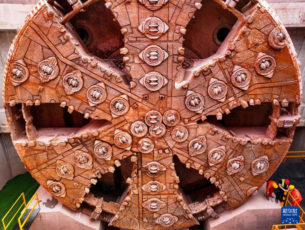 7月15日,施工人员检查出洞的“大道先锋号”超大直径盾构机刀盘(无人机照片)。