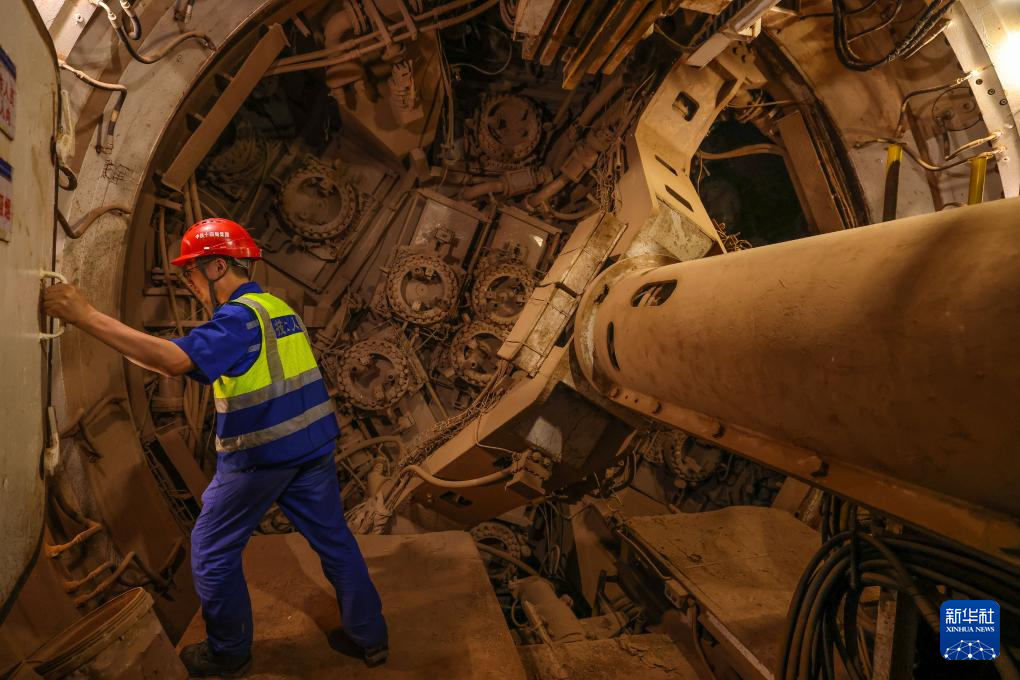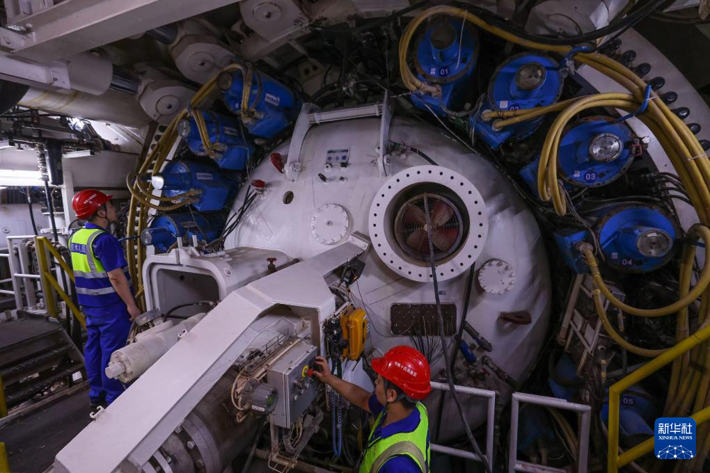 7月15日,施工人员在广州海珠湾隧道西线“大道先锋号”超大直径盾构机内检查设备。