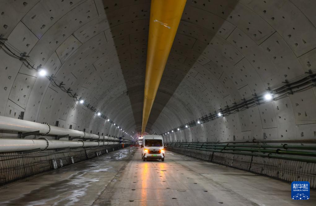 7月15日,一辆工程车行驶在广州海珠湾西线隧道内。