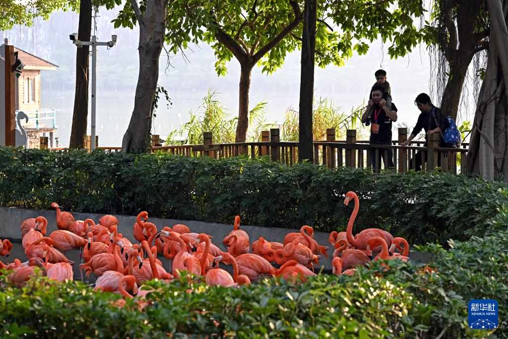 12月2日,在肇庆星湖湿地公园,游客观赏火烈鸟。