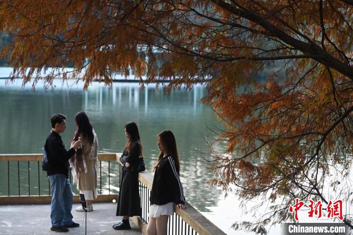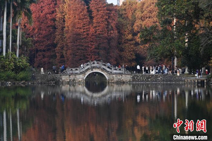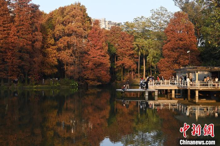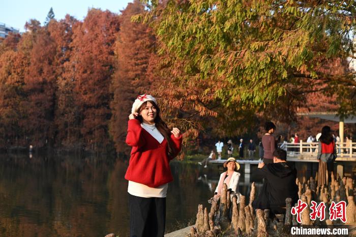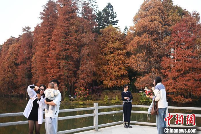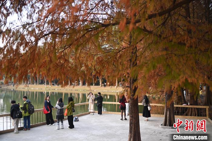 1月7日,广东省广州市,华南国家植物园的落羽杉换上“红装”,进入最佳观赏期,吸引不少游客前来观赏拍照。 中新社记者 陈楚红摄
