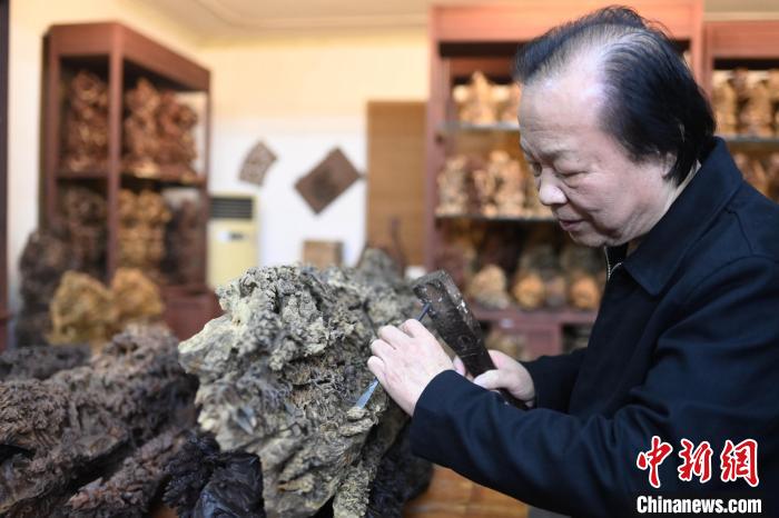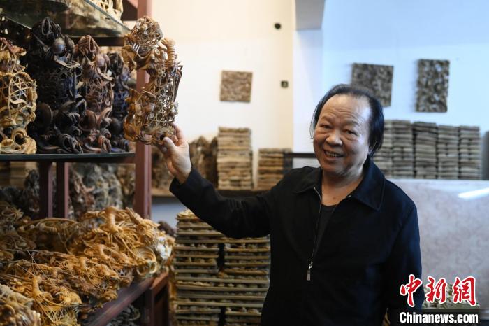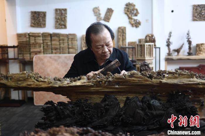 3月17日,广东省潮州市,辜柳希在工作室制作潮州木雕《龙虾蟹篓》。潮州木雕以多层次的镂通雕技法和金漆装饰手法著称,于2006年被列入第一批国家级非物质文化遗产名录。国家级非物质文化遗产潮州木雕代表性传承人、中国工艺美术大师辜柳希,深耕木雕艺坛五十余载,个人艺术创作硕果累累,且广开授徒传艺之门,推动潮州木雕传承发展。中新社记者陈楚红 摄