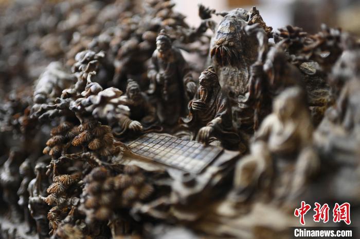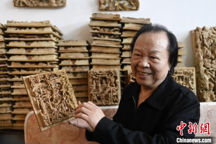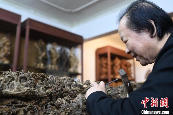 3月17日,广东省潮州市,辜柳希展示他工作室的潮州木雕作品《七贤上京》。中新社记者 陈楚红 摄