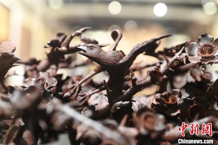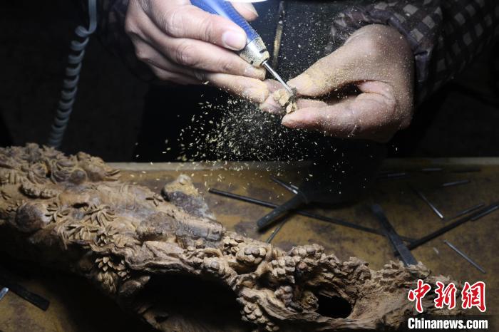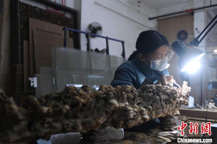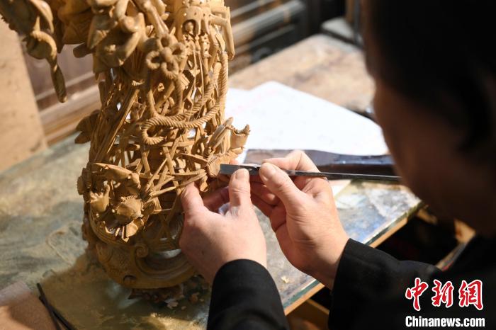3月17日,广东省潮州市,辜柳希木雕精品馆的工作人员在精雕作品。中新社记者 陈楚红 摄