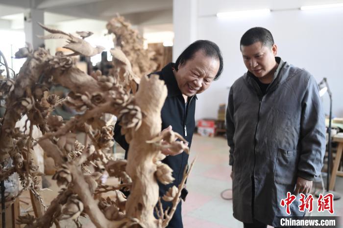 3月17日,广东省潮州市,辜柳希(左)在工作室和工作人员交流制作木雕细节。中新社记者 陈楚红 摄