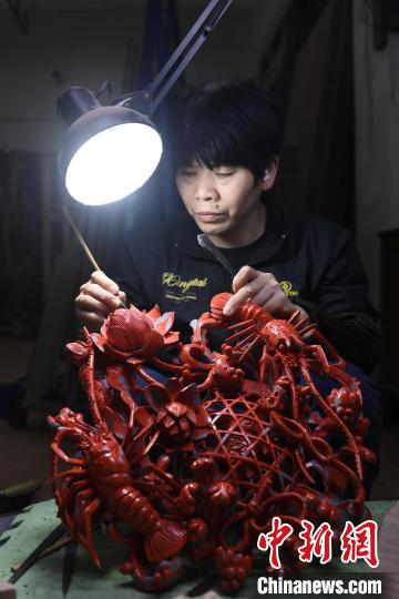 3月17日,广东省潮州市,辜柳希在工作室制作潮州木雕《龙虾蟹篓》。中新社记者 陈楚红 摄