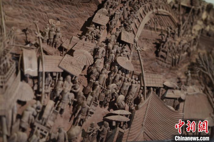 3月17日,广东省潮州市,辜柳希的潮州木雕作品《清明上河图》(局部)。中新社记者 陈楚红 摄