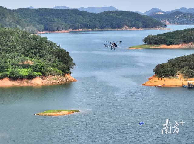 “三、二、一,起飞!”茂名高州市平山镇木禾塘村湾边岛,无人机悬停于一块空地的上方,工作人员迅速将装好筐的50斤荔枝挂上无人机。随着飞手熟练操作遥控器,启动、飞行……很快,无人机向着对岸飞去。5分钟后,荔枝“飞”过约5公里水域,送达仓储物流中心。这是广东首次实现跨水域无人机运输荔枝,助力甜蜜出岛。