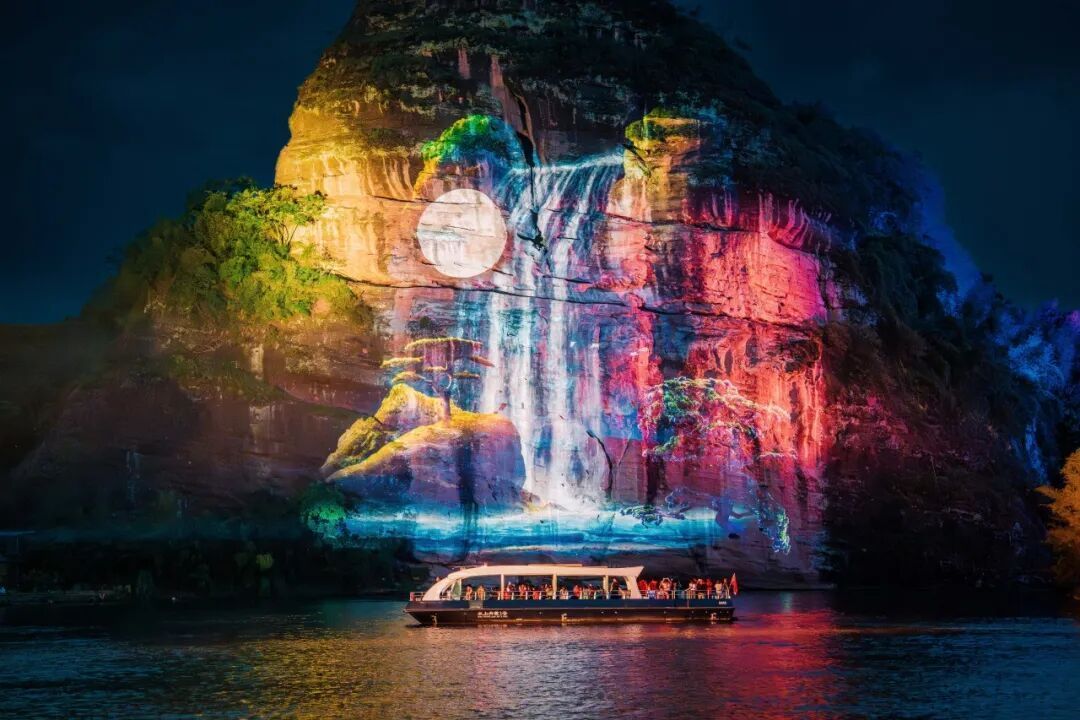 随之,锦江之上,光影变幻,一轮皎洁的圆月被温柔托起,将江面点染成一条流动的璀璨星河,与天涯共此时的诗意遥相呼应。转瞬间,山峦“裂开”,一座由光影构筑的天空之城拔地而起,飞瀑流泉是它的护城河,万家灯火是它的满天星辰。这并非幻术,而是丹霞山对人间祈愿最壮丽的回应。