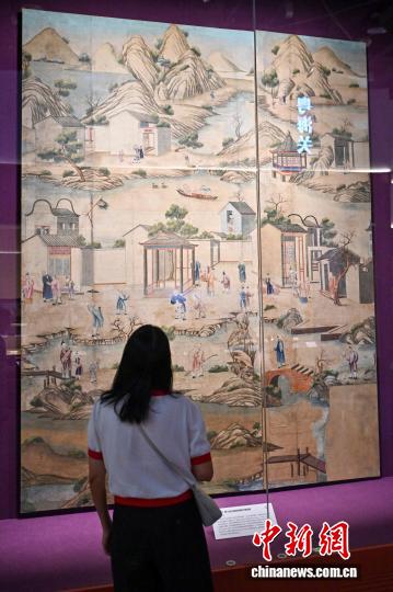 图为展出的“清乾隆广州手绘农耕商贸图外销壁纸”吸引观展者。中新社记者 陈骥旻 摄