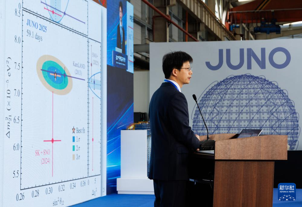 11月19日,中国牵头的国际合作项目江门中微子实验(JUNO)装置在广东省江门市发布了其建成后的首个物理成果:研究人员通过对今年8月26日至11月2日共59天有效数据的分析,测量出描述中微子振荡的两个参数,精度比此前实验的最好记录提高了1.5-1.8倍。这意味着其探测器关键性能指标全面达到或超越设计预期。
