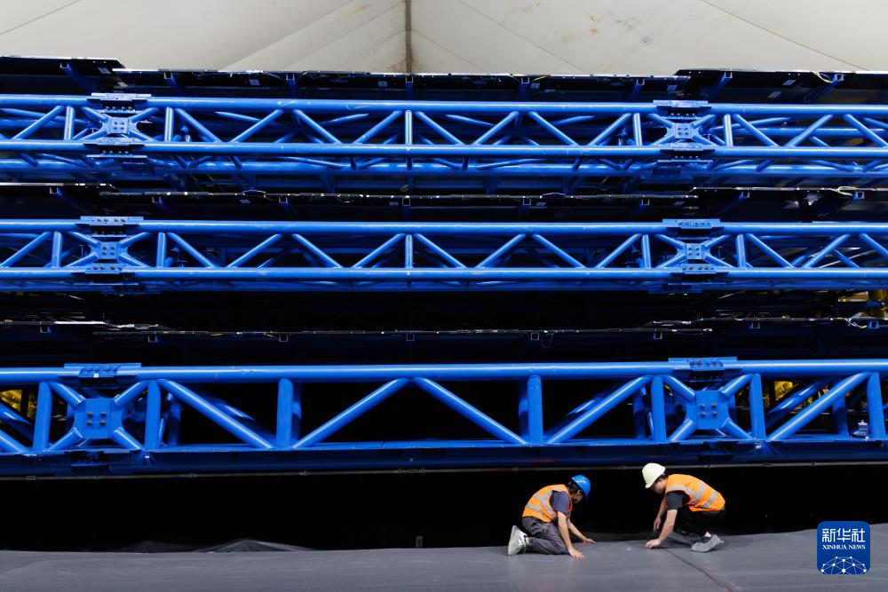 11月18日,工人在江门中微子实验大厅铺设地垫,其顶上三层是缪子探测装置。