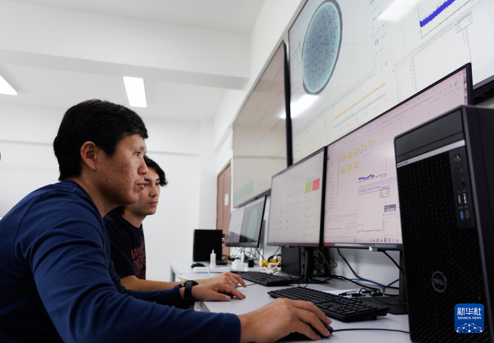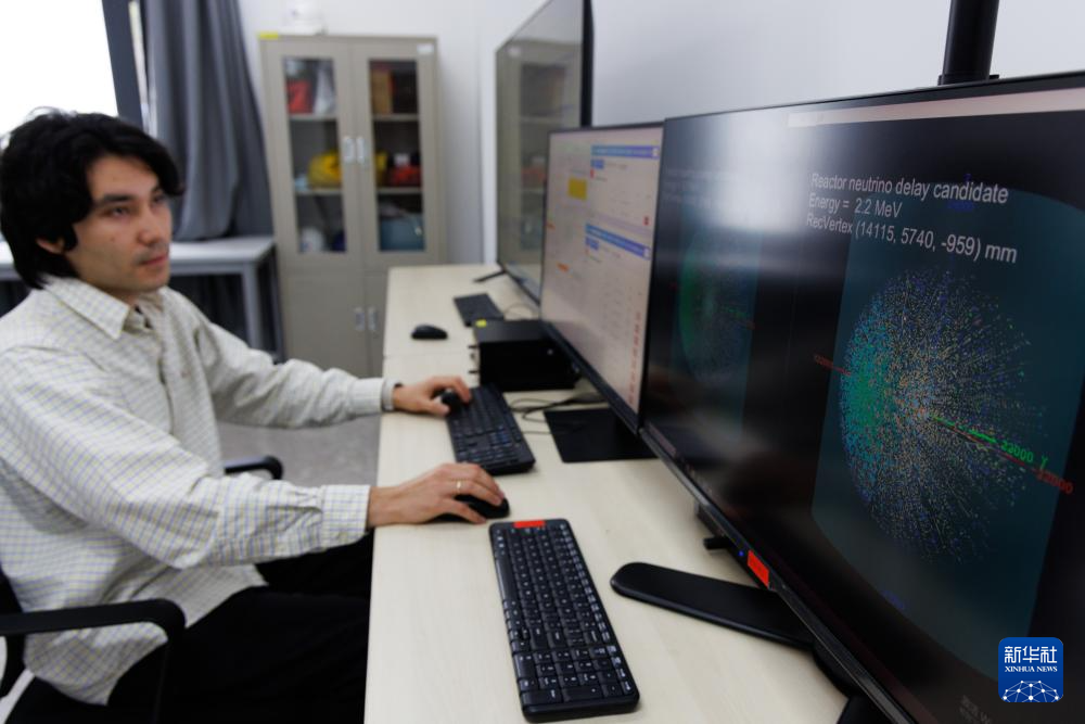 11月19日,科研人员在江门中微子实验运行控制室监测探测器运行情况。