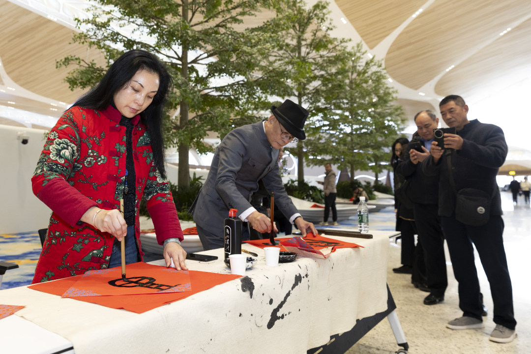 《娱乐升平》《步步高》《雨打芭蕉》《春郊试马》《喜洋洋》《彩云追月》…… 一曲曲广东音乐经典在湾区广场次第奏响。清音流转、玲珑剔透、潇洒飘逸的岭南韵味扑面而来,让现场观众在沉浸式聆听中,步入一幅流动的山水音画,尽享视听交融的双重盛宴。现场书法家铺纸研墨,开启挥春送“福”活动,一幅幅笔法遒劲的“福”字跃然纸上,承载着新年的美好期许,送到市民游客手中。