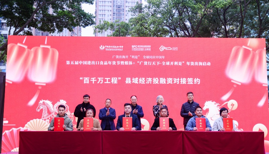 1月23日,第五届中国进出口食品年货节暨媒体+“广货行天下·全球开利是”年货出海活动在广州启幕,同期举办“百千万工程”县域优品投融资对接签约仪式,4组重点合作项目集中签约,涵盖特色农产品、花卉产业等领域,精准链接金融资源与县域产业需求,推动资金、技术、市场等要素向县域集聚,助力广东城乡区域协调发展。