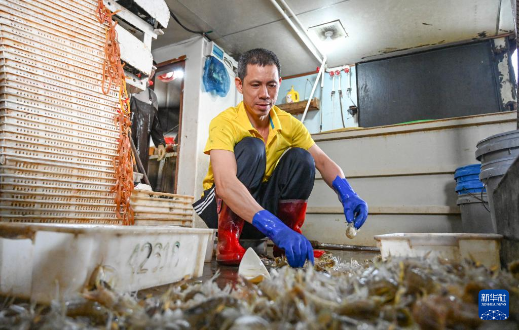 海上风云变幻,每一次下网都是一次“下注”。不同种类的渔获价格起伏不定。为尽可能提高渔获的附加值,分拣尤为关键。下午三点多,轮休的黄宁浪钻入船舱进行二次分拣,熟练地将各种鱼获按品质归类入筐。正是这种层层筛选,让好货在市场上卖出了好价钱,每一分增收的背后,都凝结着额外的汗水。