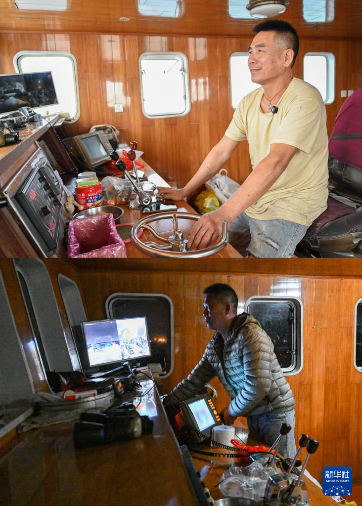 这是一张拼版照片:上图为1月28日,船长黄宁波驾船驶向下网作业地点;下图为1月29日凌晨,黄宁波将船开回博贺港,安排渔获接驳事宜。