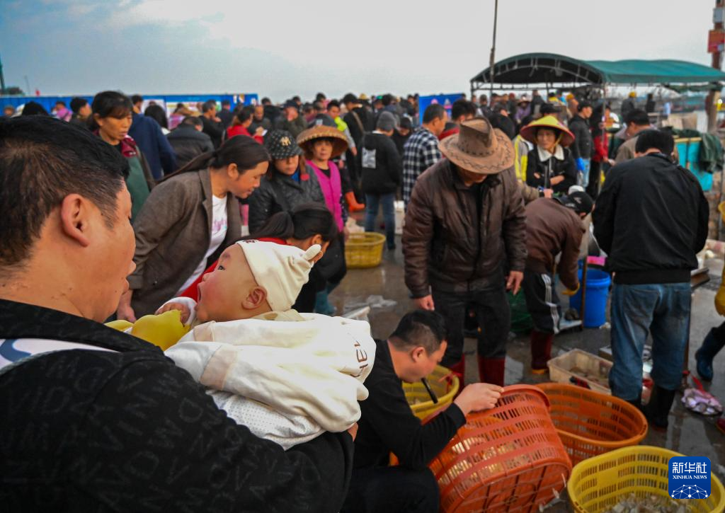 1月29日清晨,人们聚集在广东茂名博贺港码头购买海鲜。