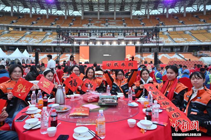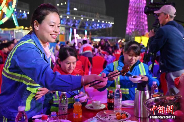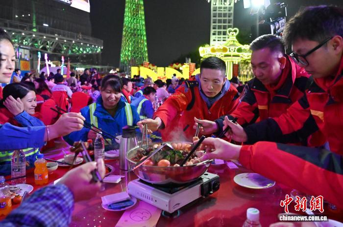 2月9日,“情暖劳动者穗岁平安年”2026年广州新春团年饭慰问活动在位于广州市的海心沙亚运公园举行。本次活动聚焦新春坚守岗位的一线劳动者,为环卫工人、快递小哥、外卖骑手、建筑工人等职工代表送上新春团年饭、慰问品与节日祝福。图为一线劳动者享用新春团年饭。中新社记者陈楚红 摄