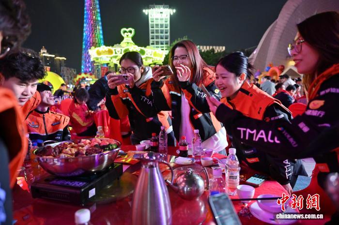 图为新春团年饭吸引一线劳动者拍照。中新社记者 陈楚红摄