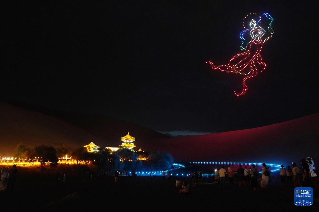 7月15日晚,游客在敦煌鸣沙山月牙泉景区观看无人机灯光秀。