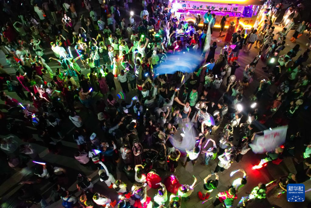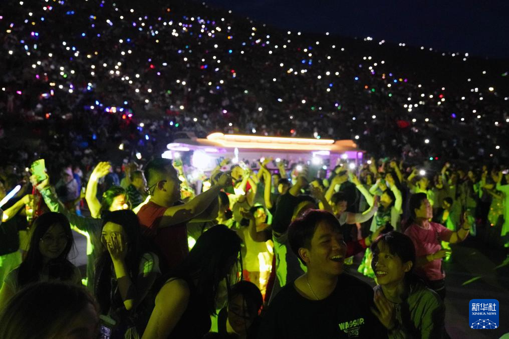 连日来,甘肃省敦煌市鸣沙山月牙泉景区2024年万人星空演唱会持续火爆,吸引了大量游客前来体验。每当夜幕降临,演唱会启幕,游客聚集在沙坡上跟随音乐尽情歌唱,同时打开手机闪光灯,与月牙泉夜景交相辉映。