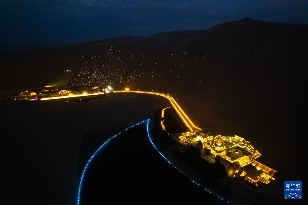7月15日晚在敦煌鸣沙山月牙泉景区拍摄的无人机灯光秀(无人机照片)。