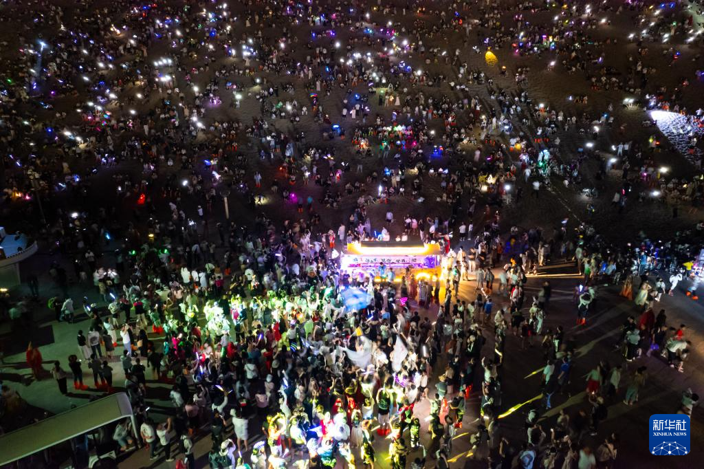 7月15日晚,游客在敦煌鸣沙山月牙泉景区参加万人星空演唱会(无人机照片)。