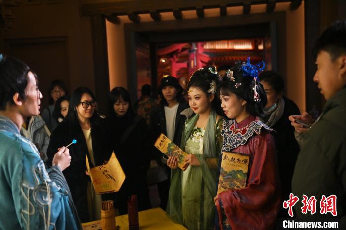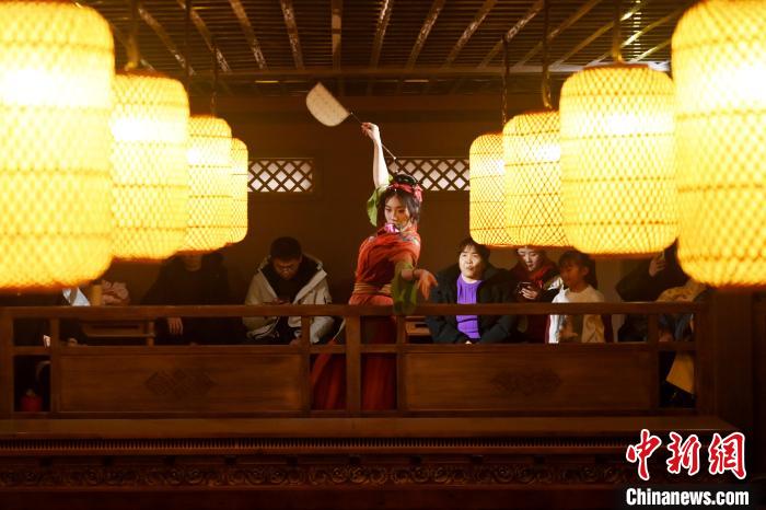 1月2日,甘肃省兰州市七里河区兰州中心《风起大汉》沉浸式演艺街区内,演职人员进行表演。2024年12月29日,汉文化主题文商旅体验街区《风起大汉》亮相兰州,开启了游客与大汉邂逅的穿越之旅。《风起大汉》采用“行进式+多维演艺集群”的方式,游客需要在1.5万平方米的沉浸式演艺街区与高适、岑参、张骞等大量历史角色互动,参与剧情故事推进来完成任务。游客还可以在金城关、千佛窟、黄河渡等核心区观赏《乐府极乐宴》《大千世界》《水月梵音》《龙门客栈》等十多个沉浸式演绎。中新社记者李亚龙 摄