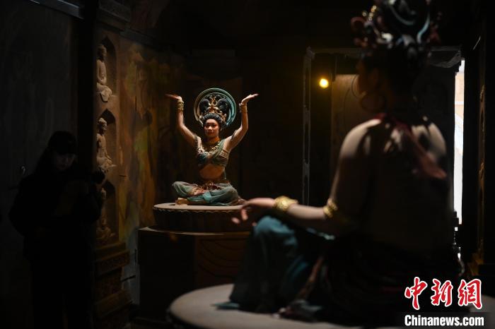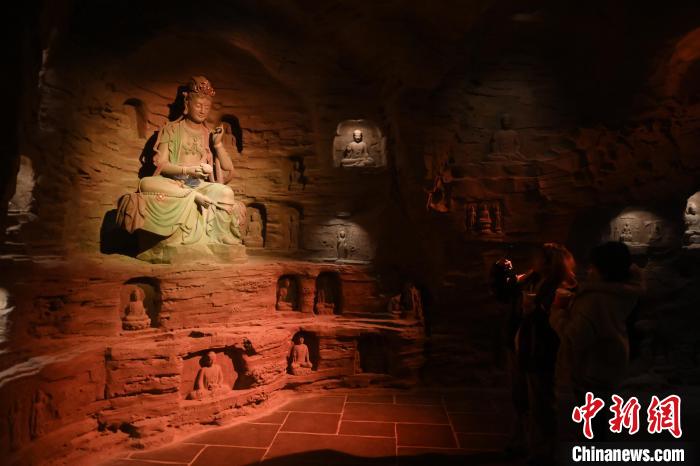 1月2日,甘肃省兰州市七里河区兰州中心《风起大汉》沉浸式演艺街区内,游人拍摄千佛窟。中新社记者 李亚龙 摄