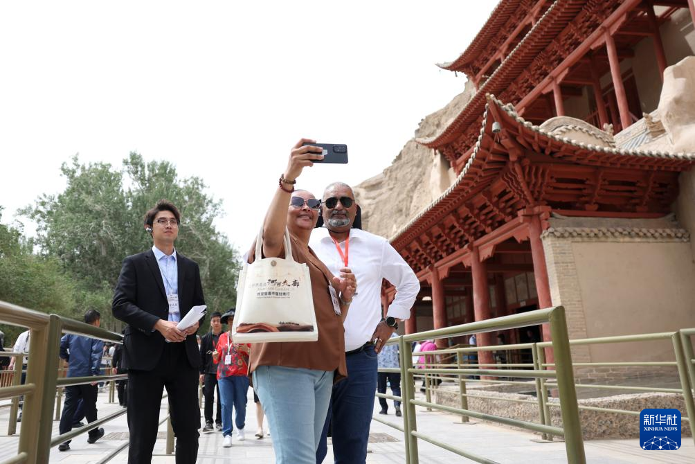 2024年6月7日,前来甘肃调研考察的驻华外交官在敦煌莫高窟九层楼前留影。