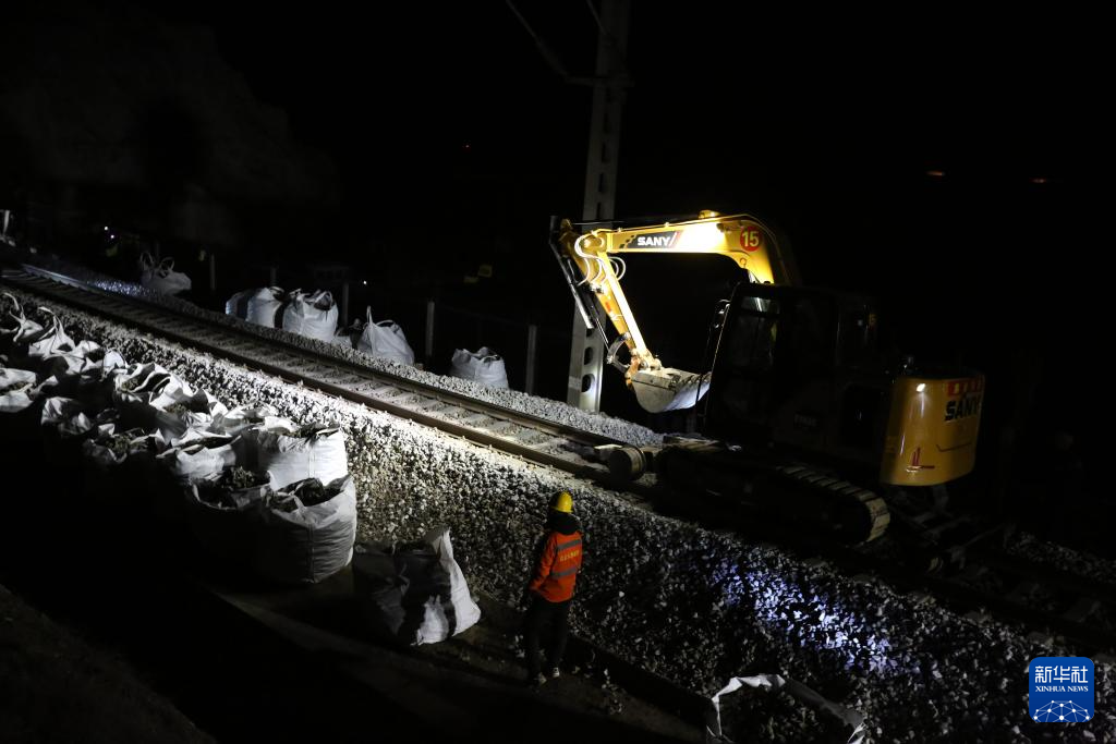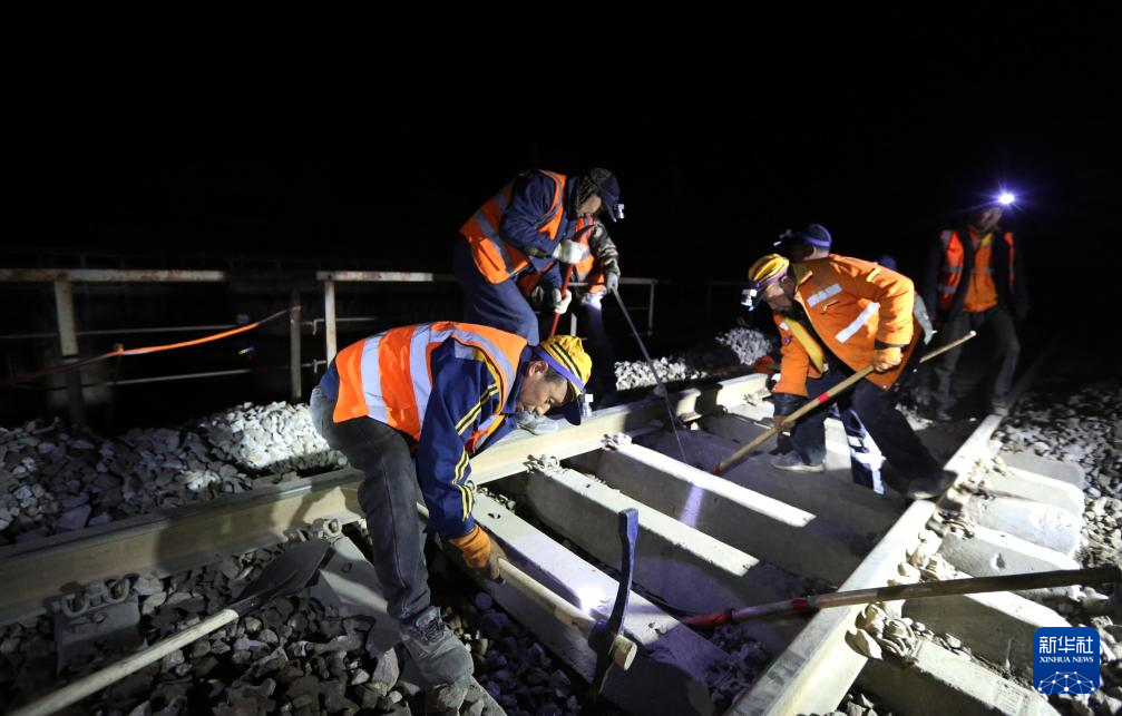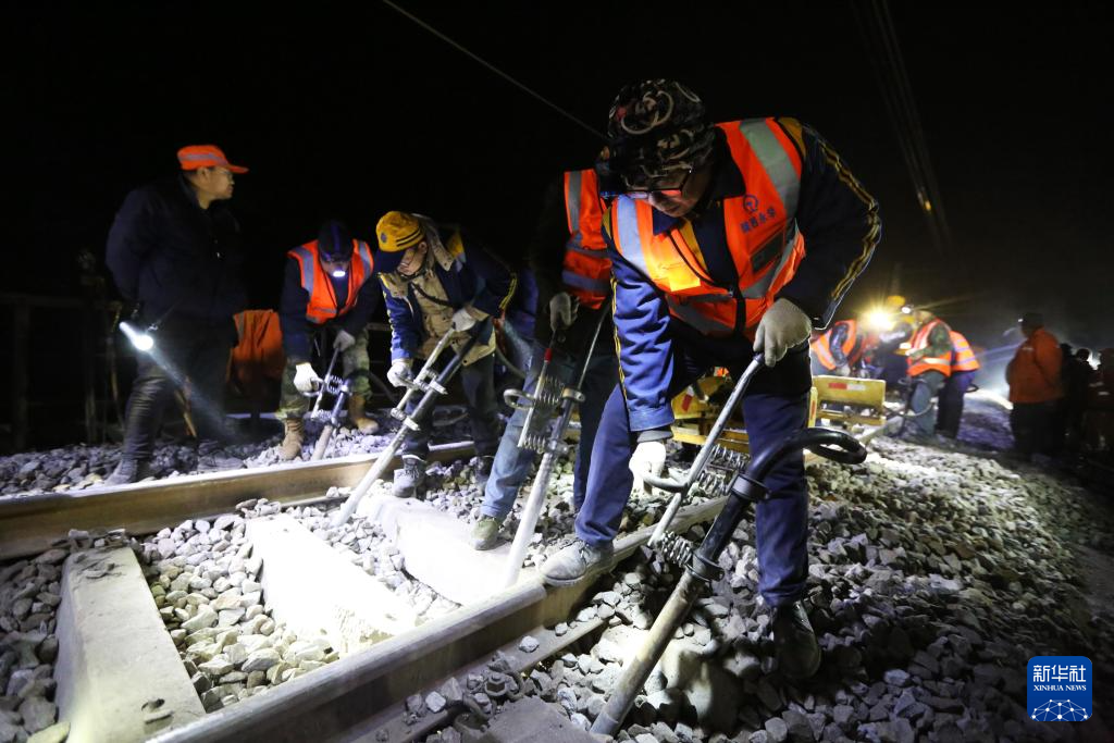 2月24日,铁路职工在陇海铁路甘肃省榆中县境内进行桥面人工捣固施工作业。