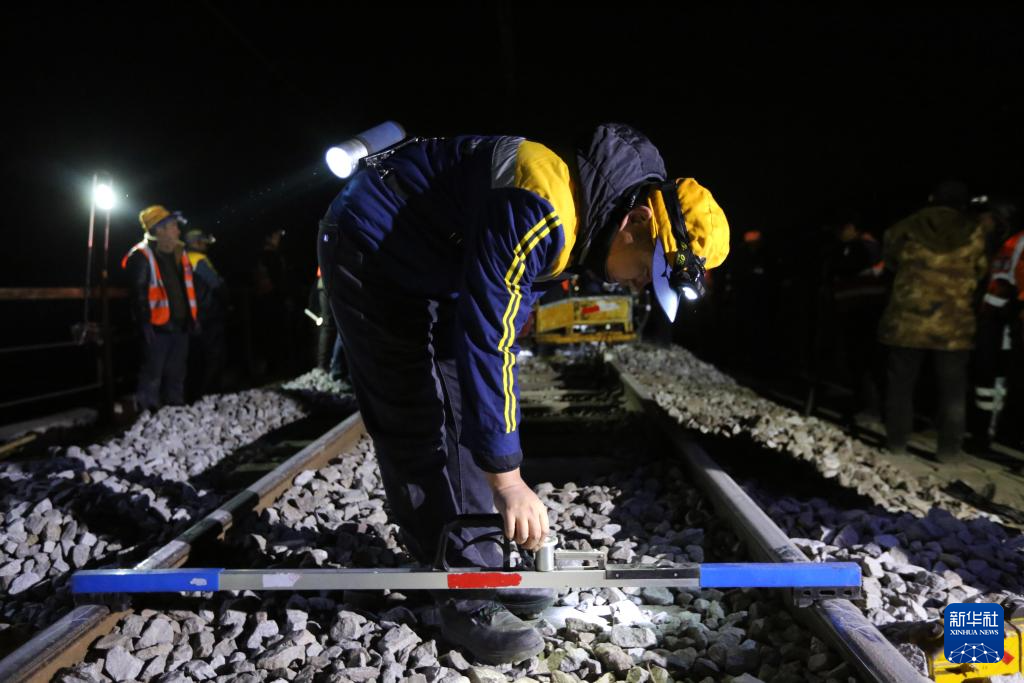 2月24日,作业人员在陇海铁路甘肃省榆中县境内使用道尺测量线路几何尺寸。
