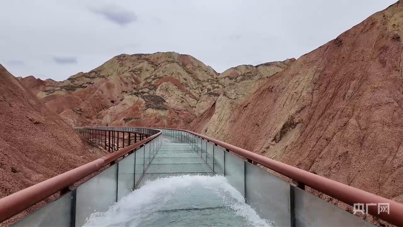 游客乘坐玻璃水滑道穿越丹霞谷底(央广网记者 魏晋雪摄)