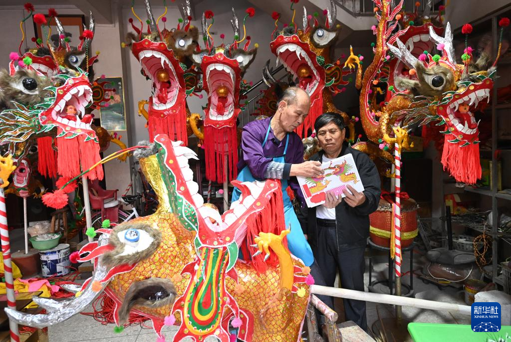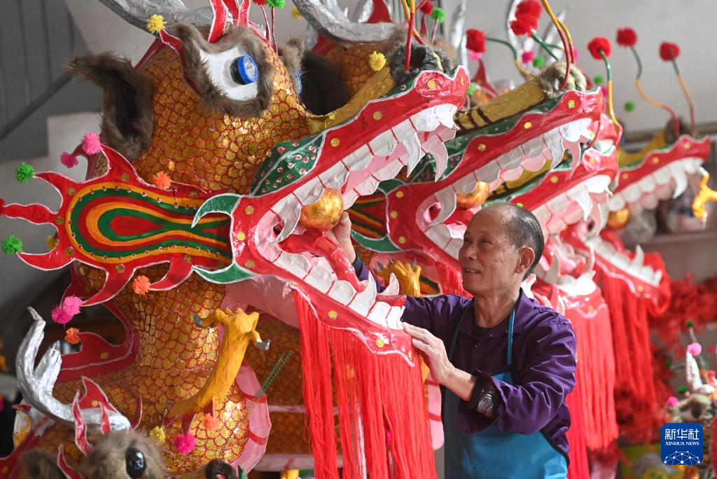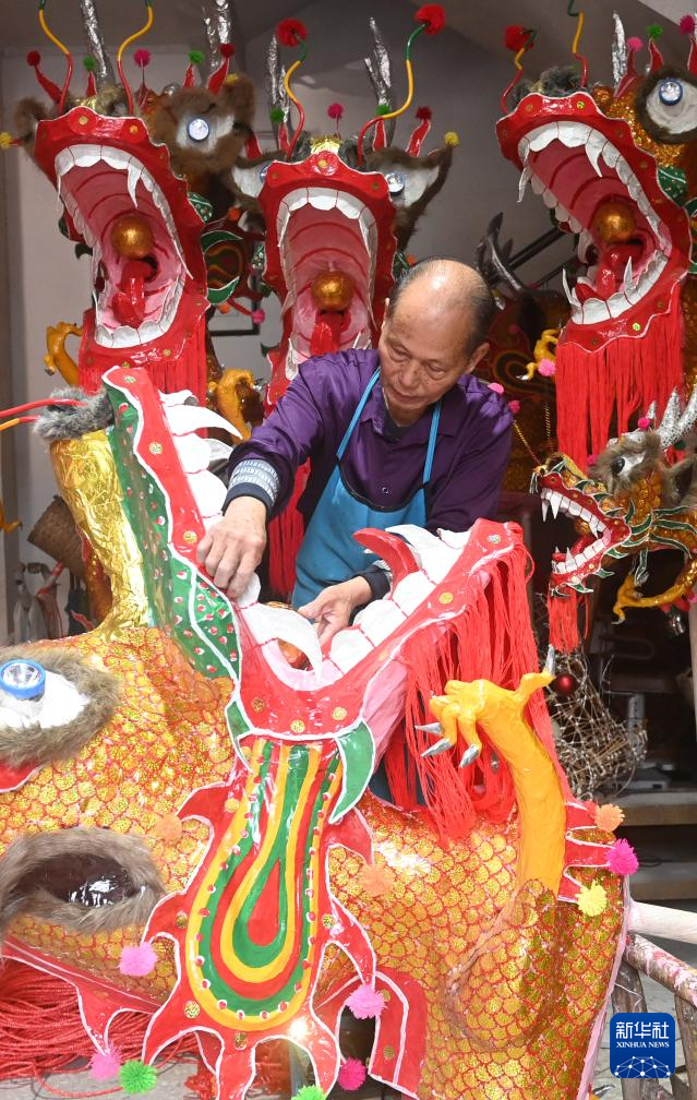1月16日,在广西宾阳县宾州镇三联街,邹玉特在装饰龙爪。