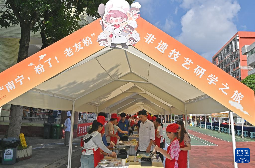 当日,广西南宁市第一职业技术学校举行老友粉研学活动,孩子和家长一起参观广西名小吃展示馆、学习老友粉制作技艺,独特的研学活动深受孩子和家长喜爱。