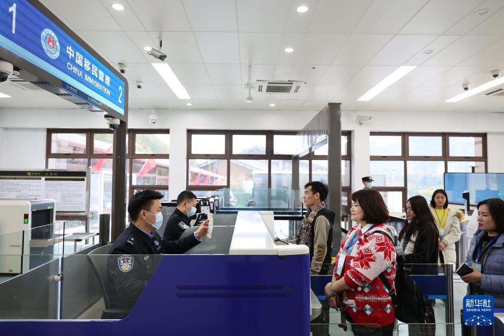 12月15日,在中越德天(板约)瀑布跨境旅游合作区,游客排队通过跨境游出境通道。