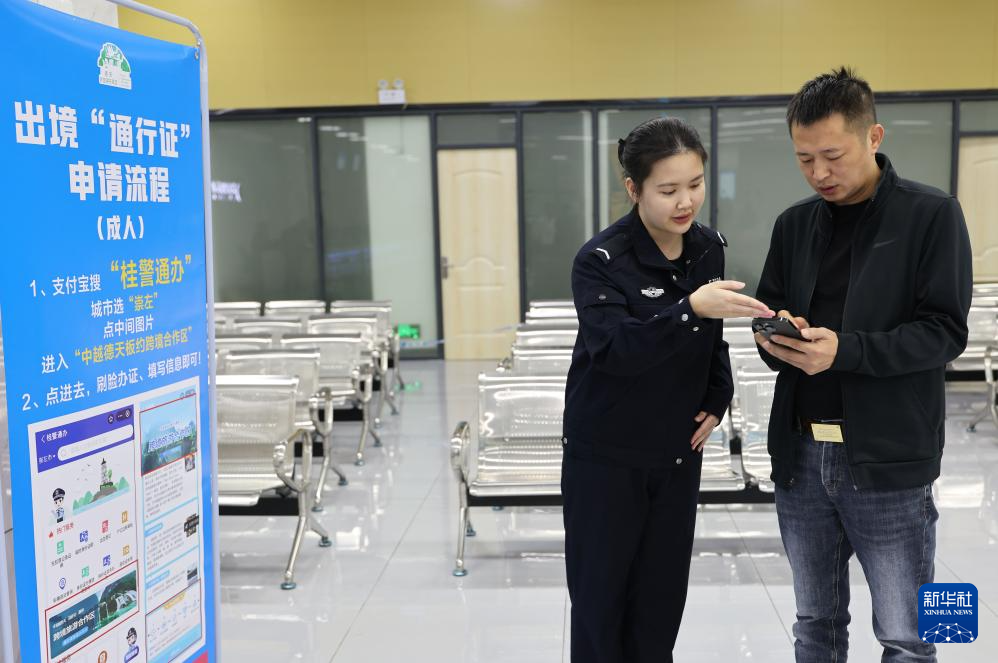 12月6日,在中越德天(板约)瀑布跨境旅游合作区出入境办证大厅,游客(右)线上申请跨境游出入境证件。