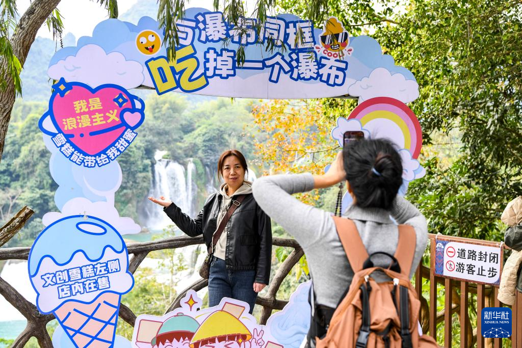 12月15日,游客在中越德天(板约)瀑布跨境旅游合作区拍照。